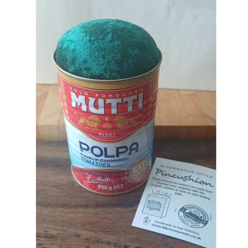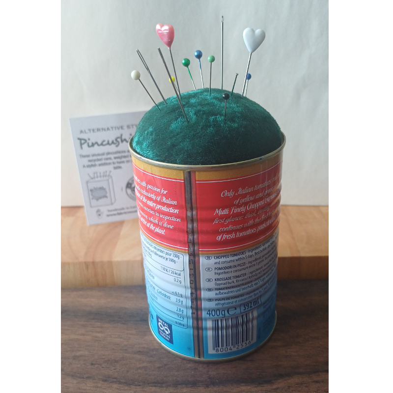 These unusual, alternative style pincushions are made from recycled food cans, weighted with dried rice and with a velvet plush top for inserting your pins.