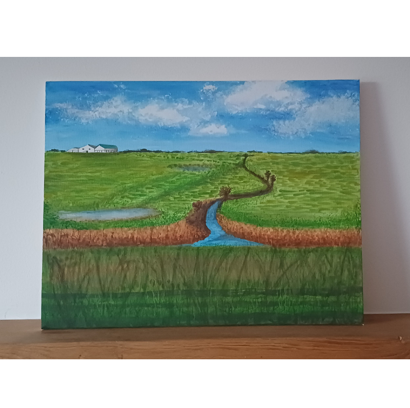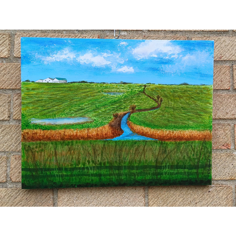 The subject matter is a local agricultural landscape, the springtime fields and full drains between the villages of Welwick and Weeton in the saltmarsh area of Holderness in East Yorkshire.