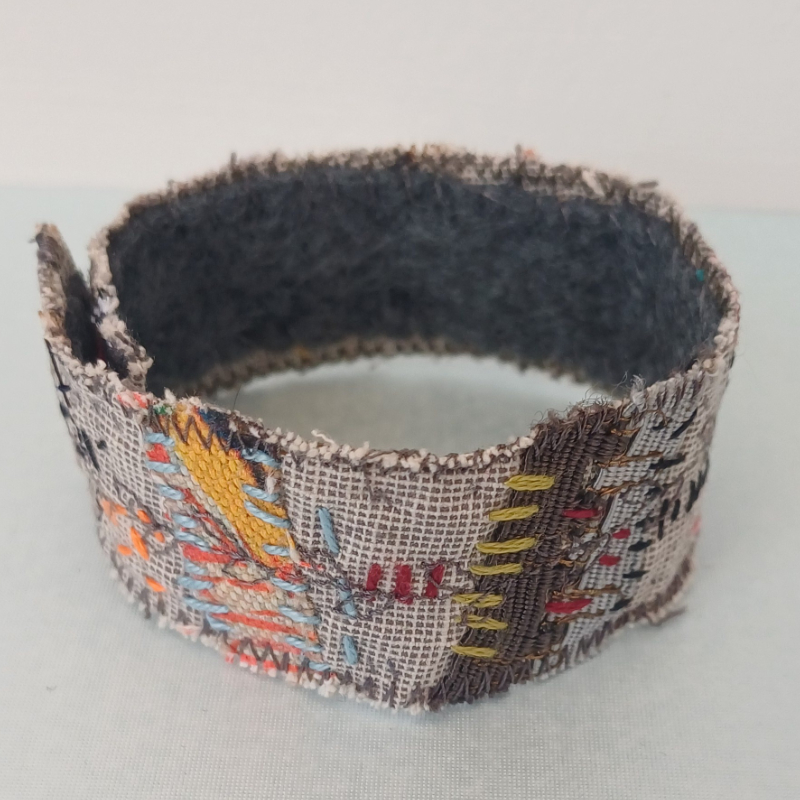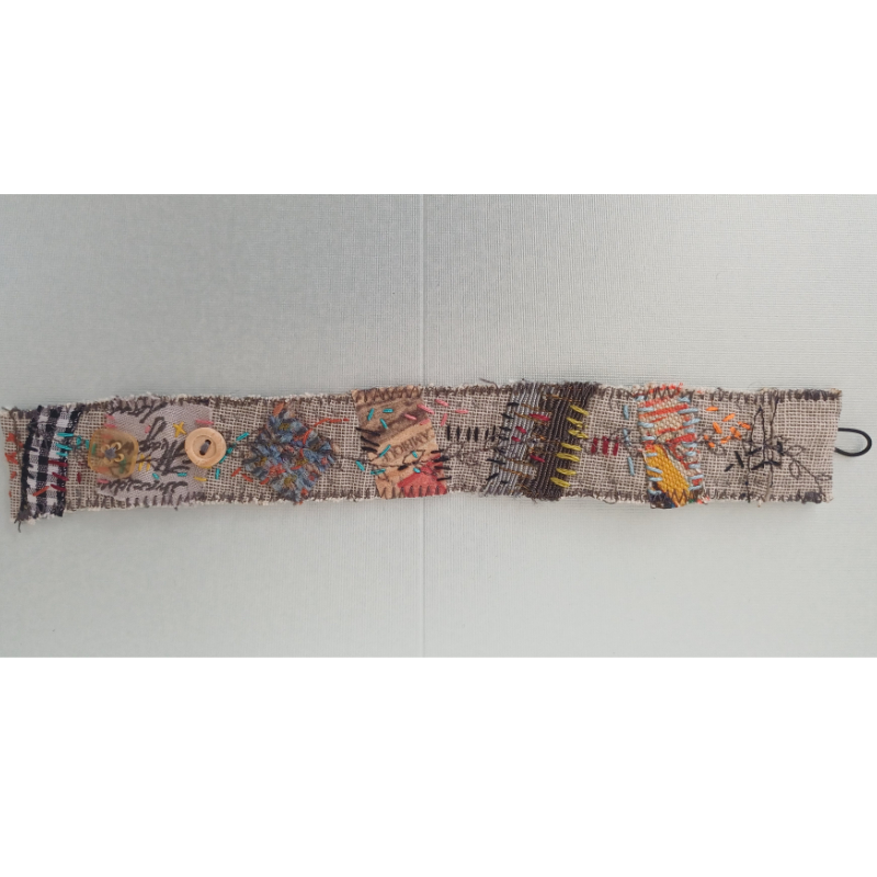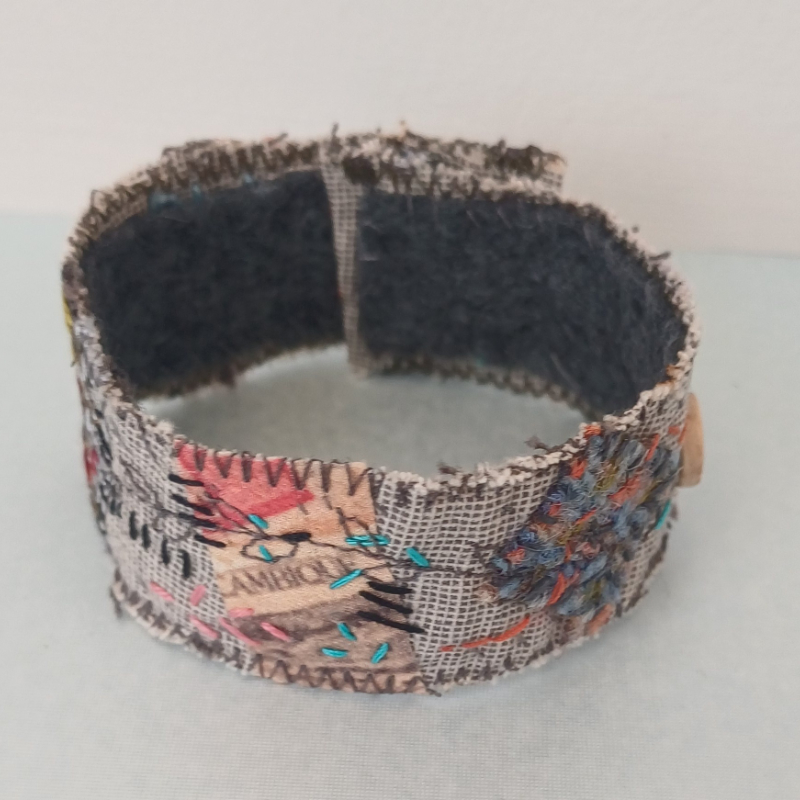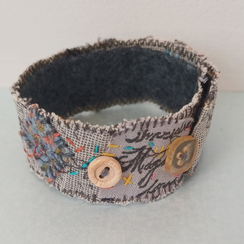 These unusual wrist cuffs are made with repurposed fabric scraps, embellished with the visible mending technique. The rustic, hand stitched and slightly frayed fabric is part of the unique charm of these individual pieces.
